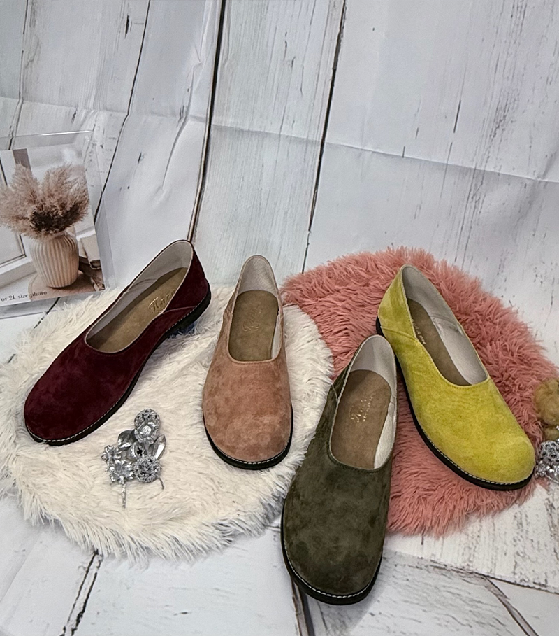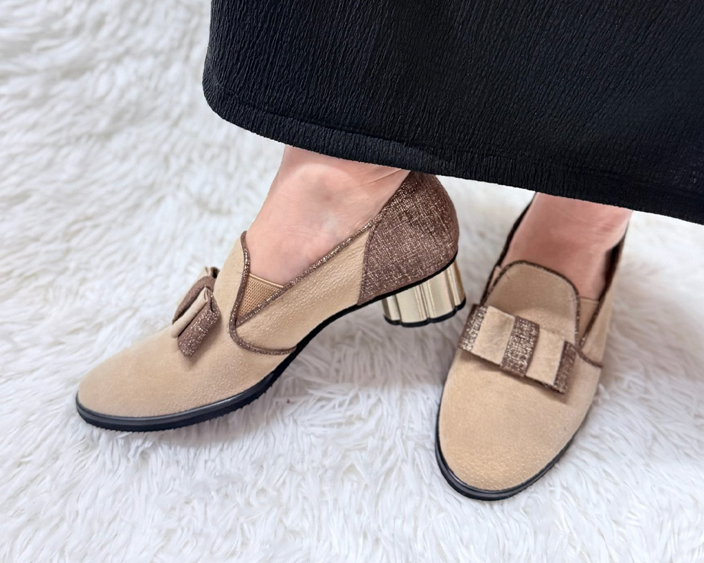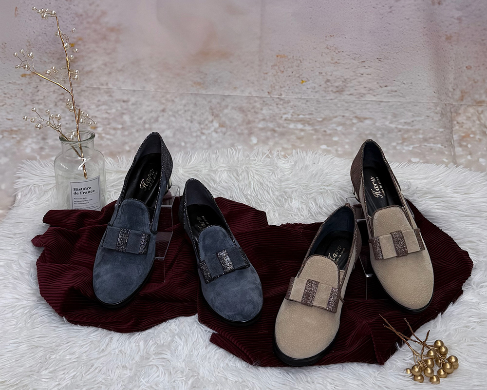 Pig本革スエード✖Pig本革箔のコンビネーションと、キラキラしたフラワーヒールが上品で華やかな、高級感あふれるローファーシューズ誕生です💛