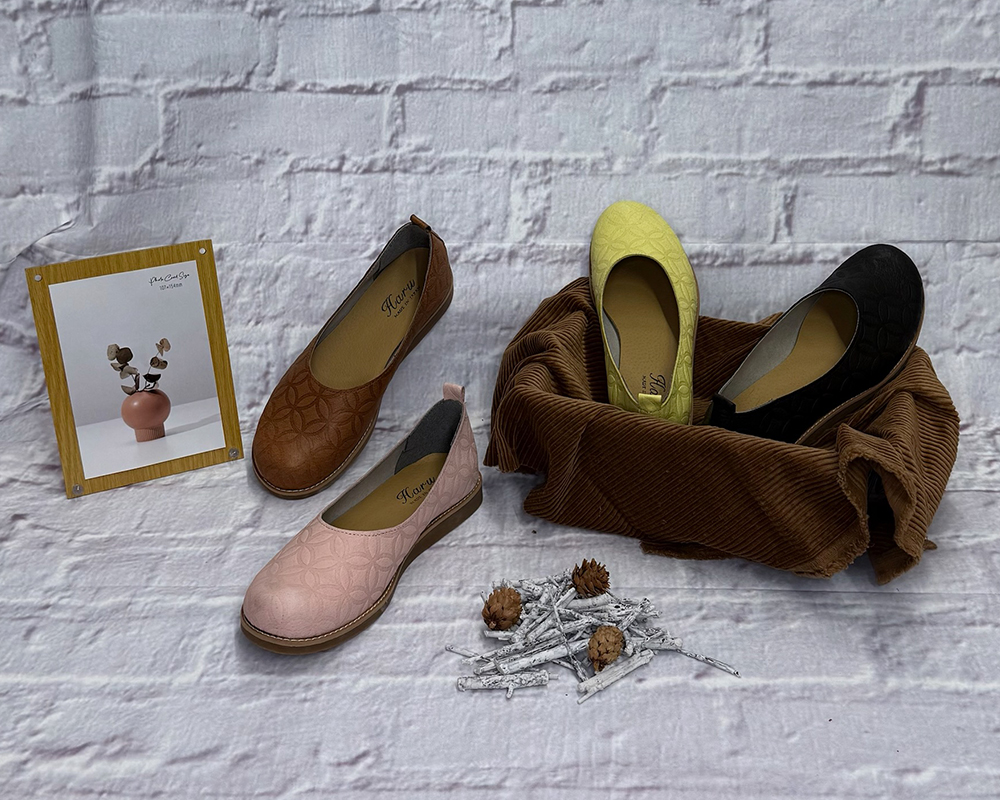 明るい色合いの「七宝柄」とのバランスで鮮やかなシューズにすることで、Pig本革でありながら高級感を兼ね備えたカジュアルな足元に、ファション性も重視した新たな『HARU』が提案するバレーシューズとして誕生★写真をクリックすると拡大画像がご覧になれます